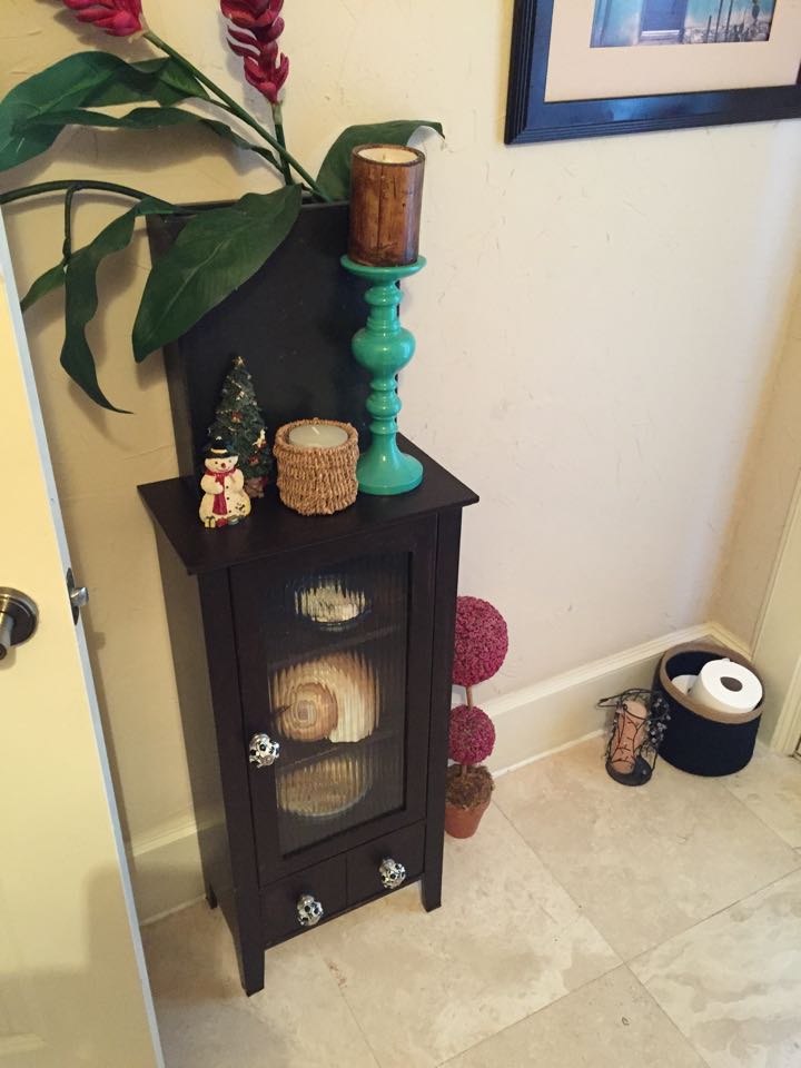 Oh, how I do love me some gel stain! A couple of years ago I used General Finishes Gel Stain in Walnut to do my stairs and kitchen cabinets.  I was really happy with the results and it was so easy to do. Just wipe it on, you don’t even need to sand first. I have recently discovered that you don’t need to apply it to wood, so I have been slapping it all over the place. I stained a cheap little white formica cabinet and added some knobs I found for $3 at Homegoods, and it looks so much better!